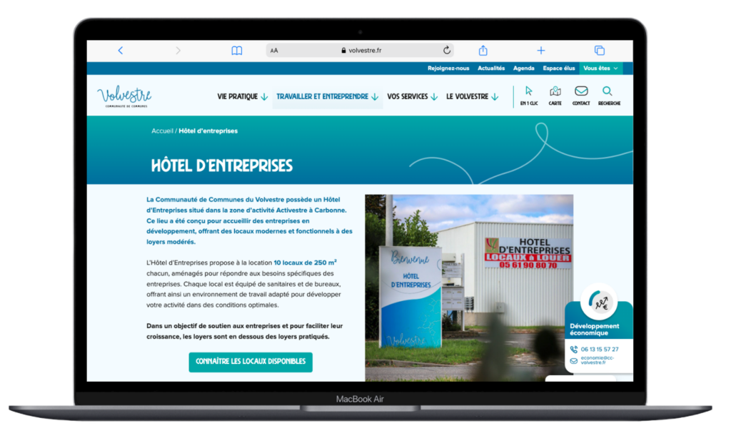 Nous avons notamment mis en place pour d’autres clients un onglet de contact direct en sticky (fixe) sur le côté de la page. C’est une solution discrète, mais toujours présente.