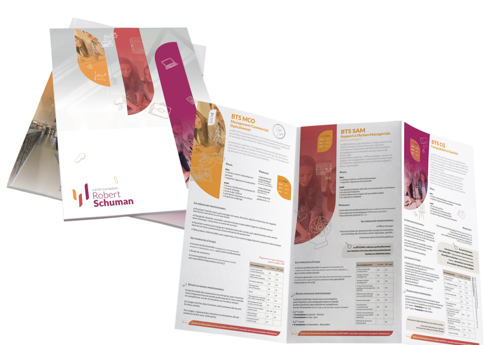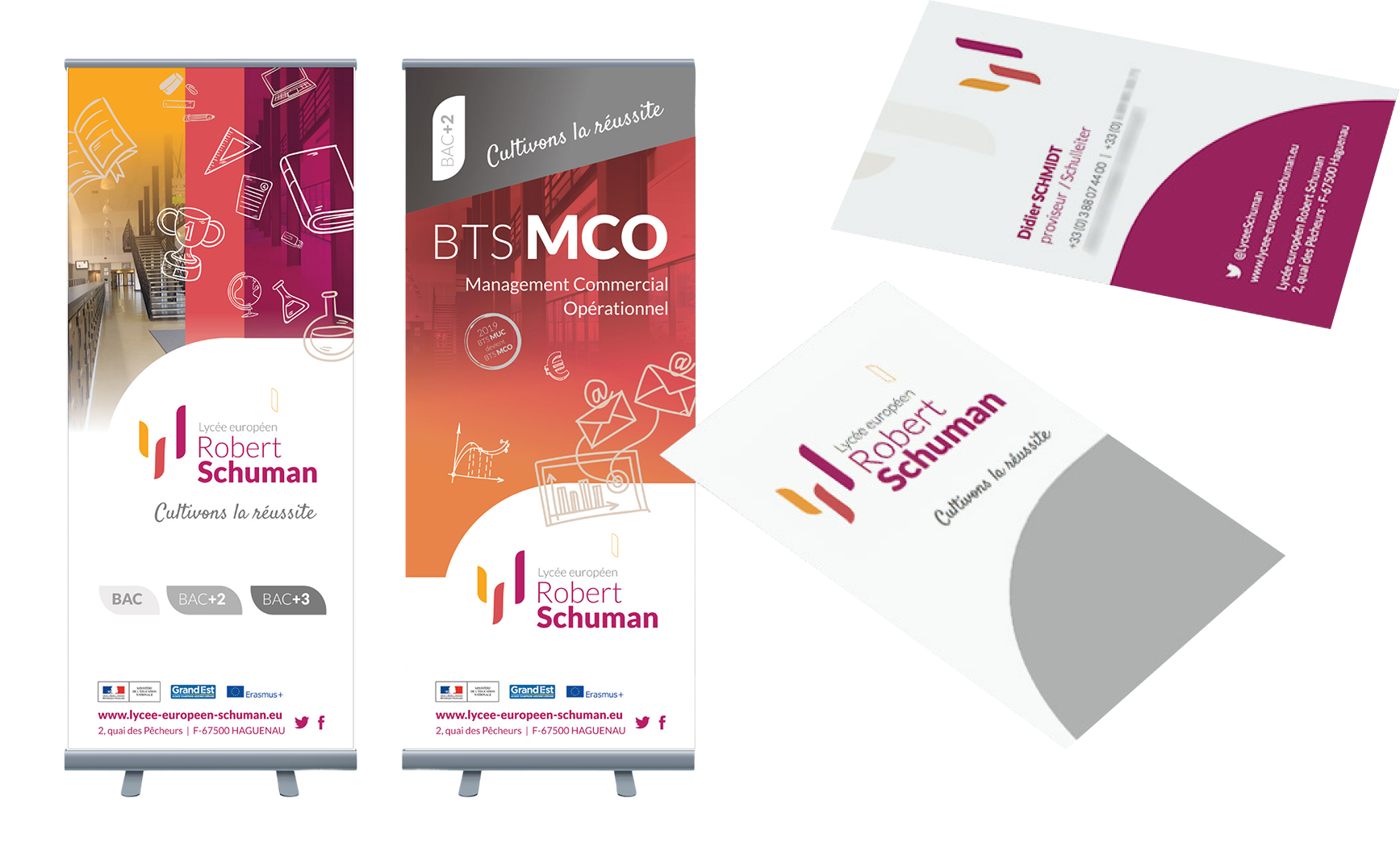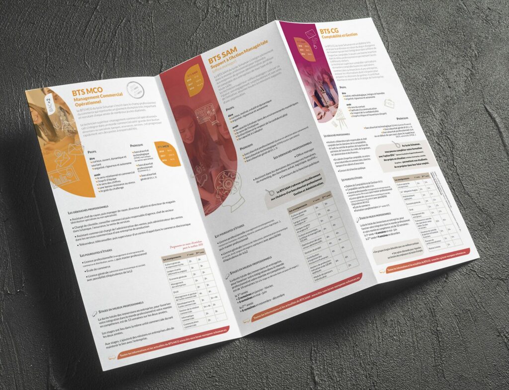 Au travers de plusieurs ateliers, et en impliquant l’équipe pédagogique du lycée, nous avons proposé un nouveau positionnement de communication qui s’est illustré sur une nouvelle identité puis s’est décliné sur l’ensemble des supports de communication institutionnels et événementiels : plaquettes d’informations, fiches formations, flyer, roll-up…